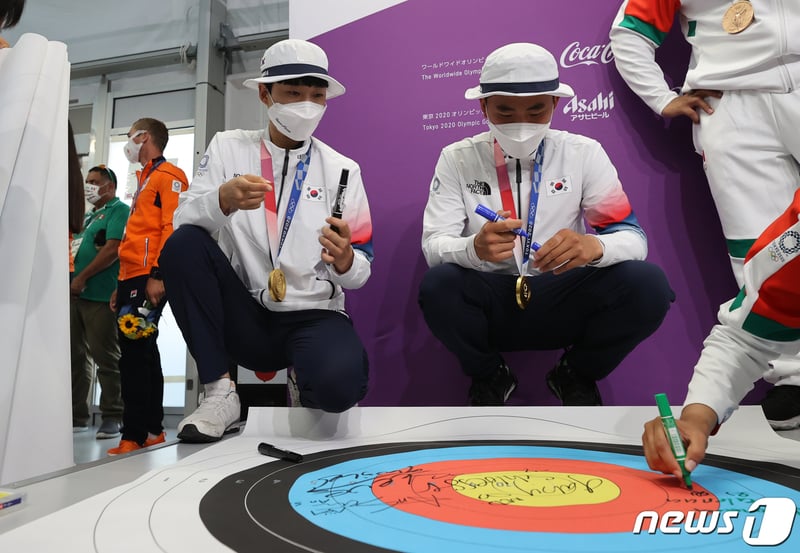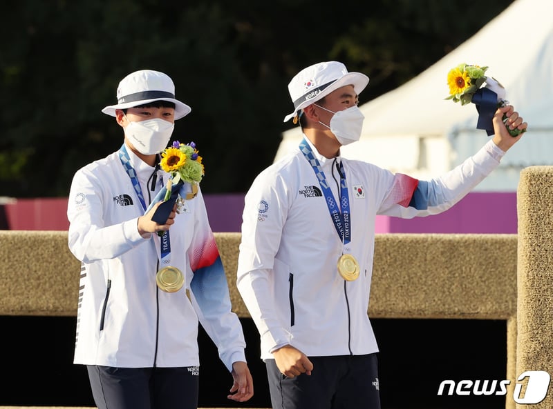 / 김제덕 - 서로 금메달 걸어주는 김우진과 김제덕 MK포토 - MK스포츠 : 쿠키뉴스 김찬홍 기자 = 한국 양궁 대표팀의 막내 김제덕(17·경북일고)과 안산(20·광주여대)이 형, 언니들을 제치고 올림픽 양궁 사상 첫 3관왕에 도전할.